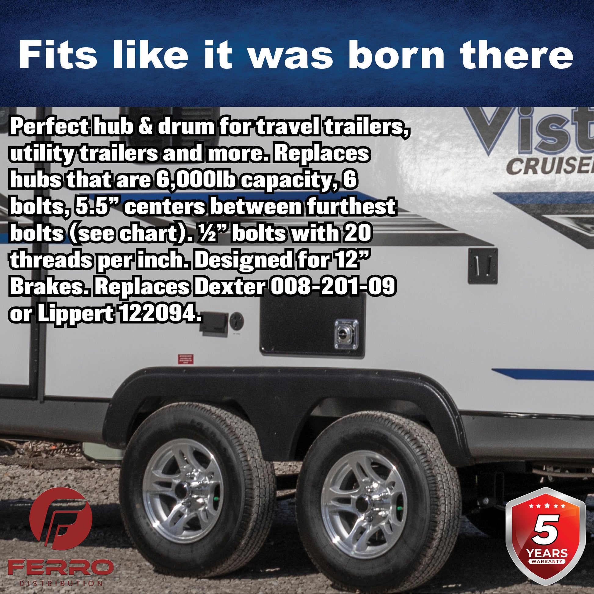 - PERFECT OEM-FIT HUB & DRUM REPLACEMENT: Perfect hub & drum for RVS, utility trailers, boat trailers and more. Replaces hubs that are 6,000lb capacity, 6 bolts, 5.5” centers between furthest bolts (see chart). ½” bolts with 20 threads per inch. Designed for 12" Brakes. Replaces Dexter 008-201-09 or Lippert 122094.